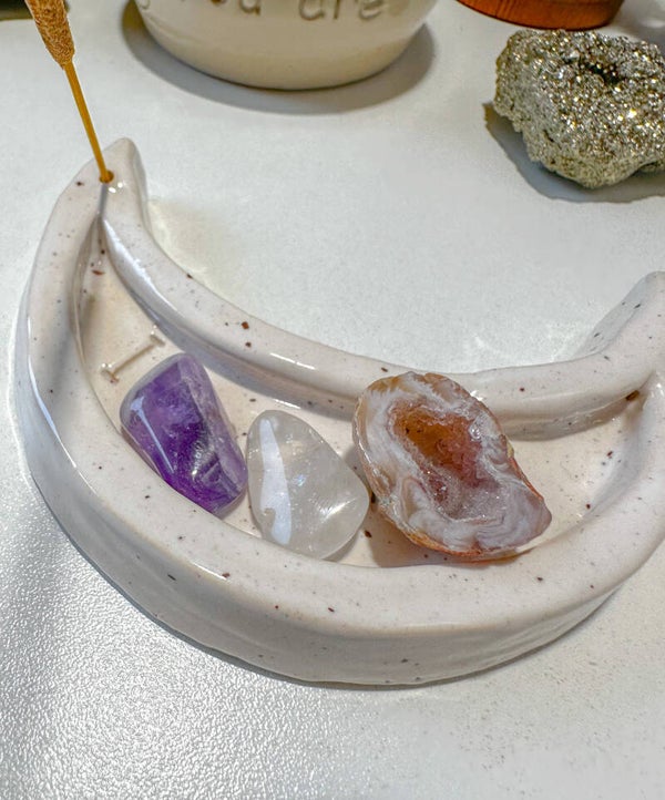 Handgemaakt keramieken Maanschaaltje met de tekst " I receive" en een gaatje voor een wierookstokje.