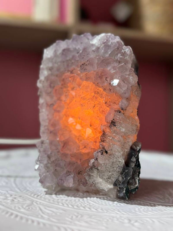 Supermooie Amethist lamp ( Brazilië) met Goethiet en stukjes sugar coating, inclusief witte stekker en lampje.