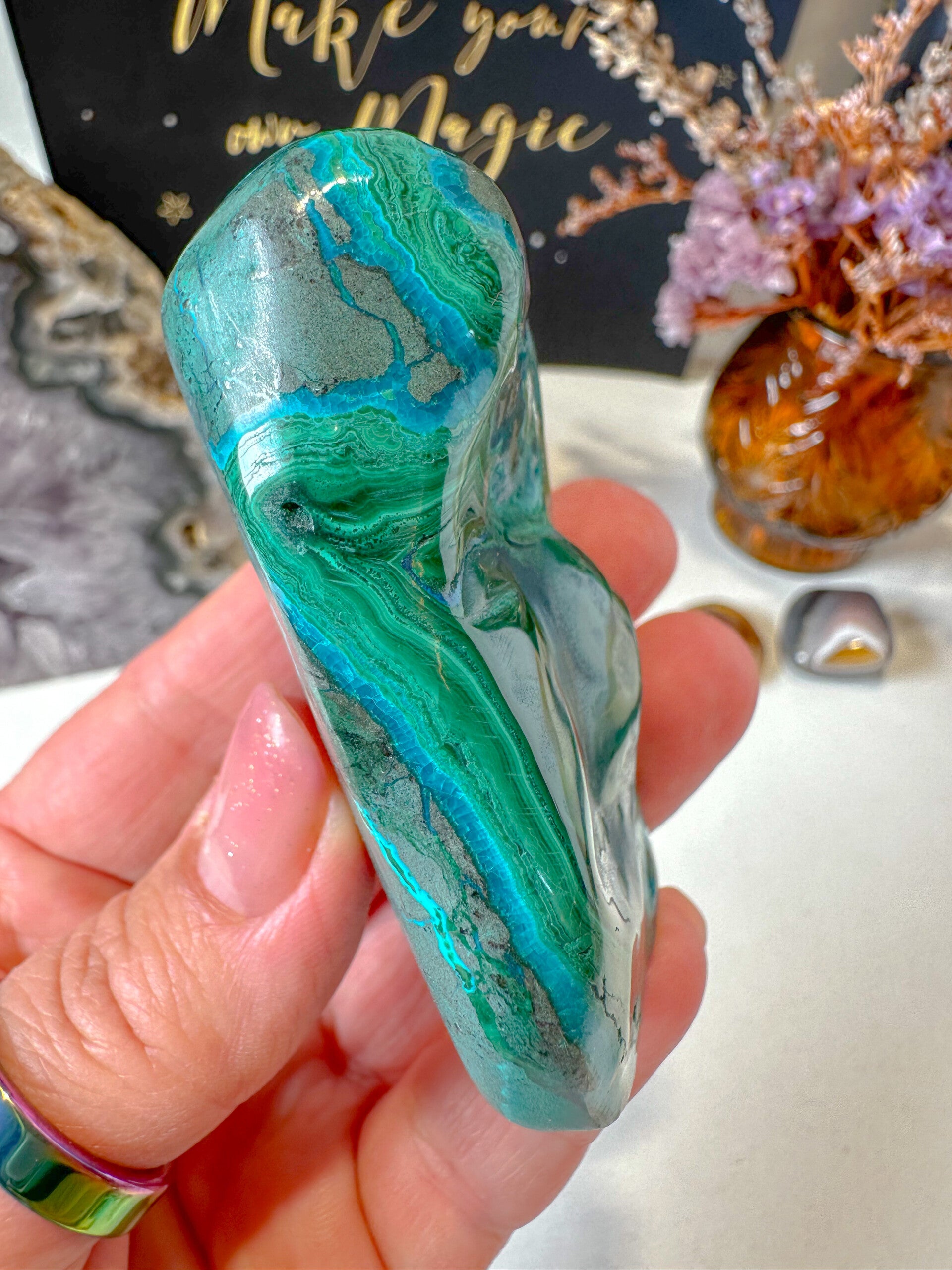 Malacolla verenigt de energie van chrysocolla en malachiet in zich.