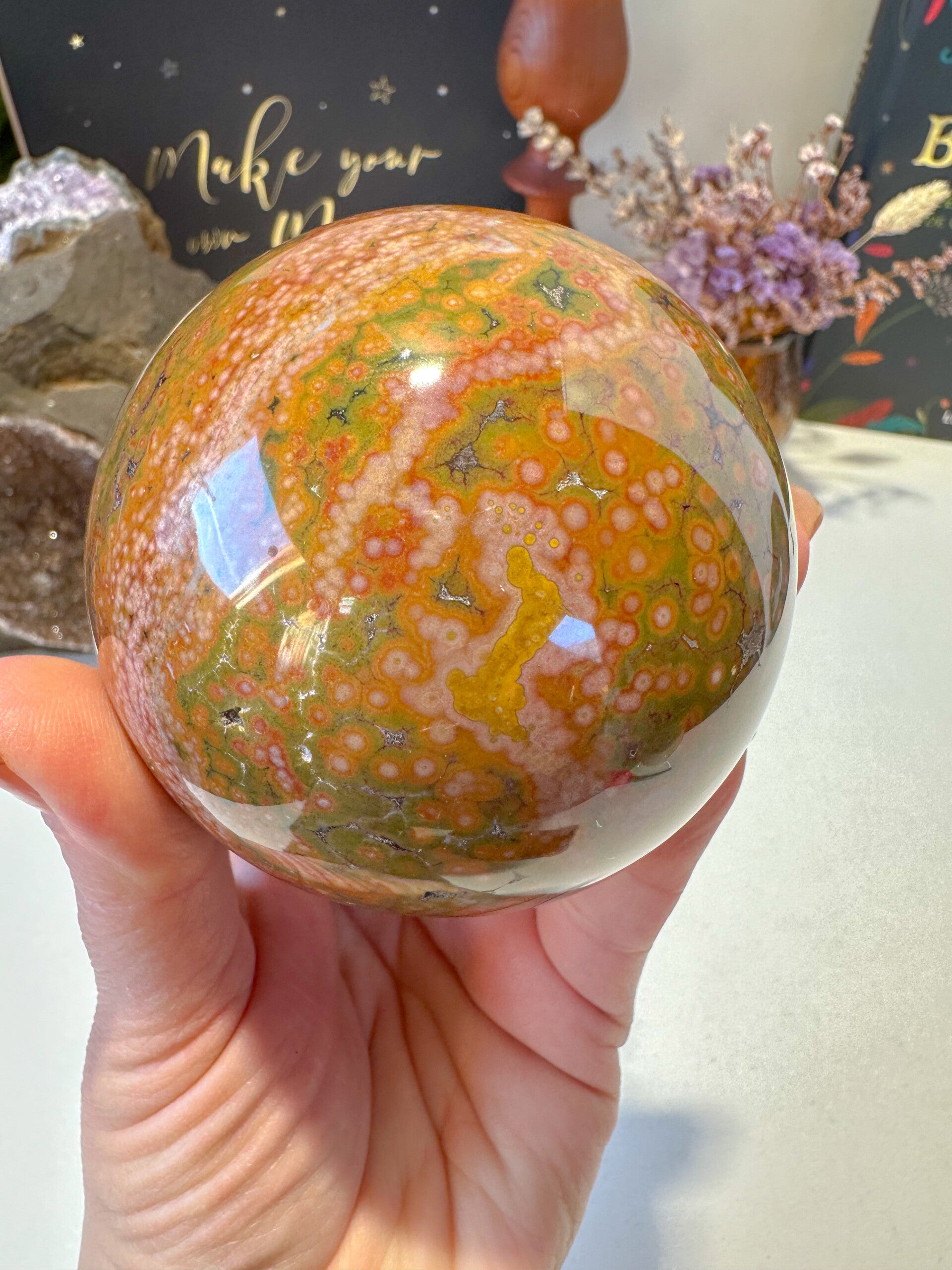 Grote A kwaliteit Oceaan Jaspis bol in roze en groene tinten.