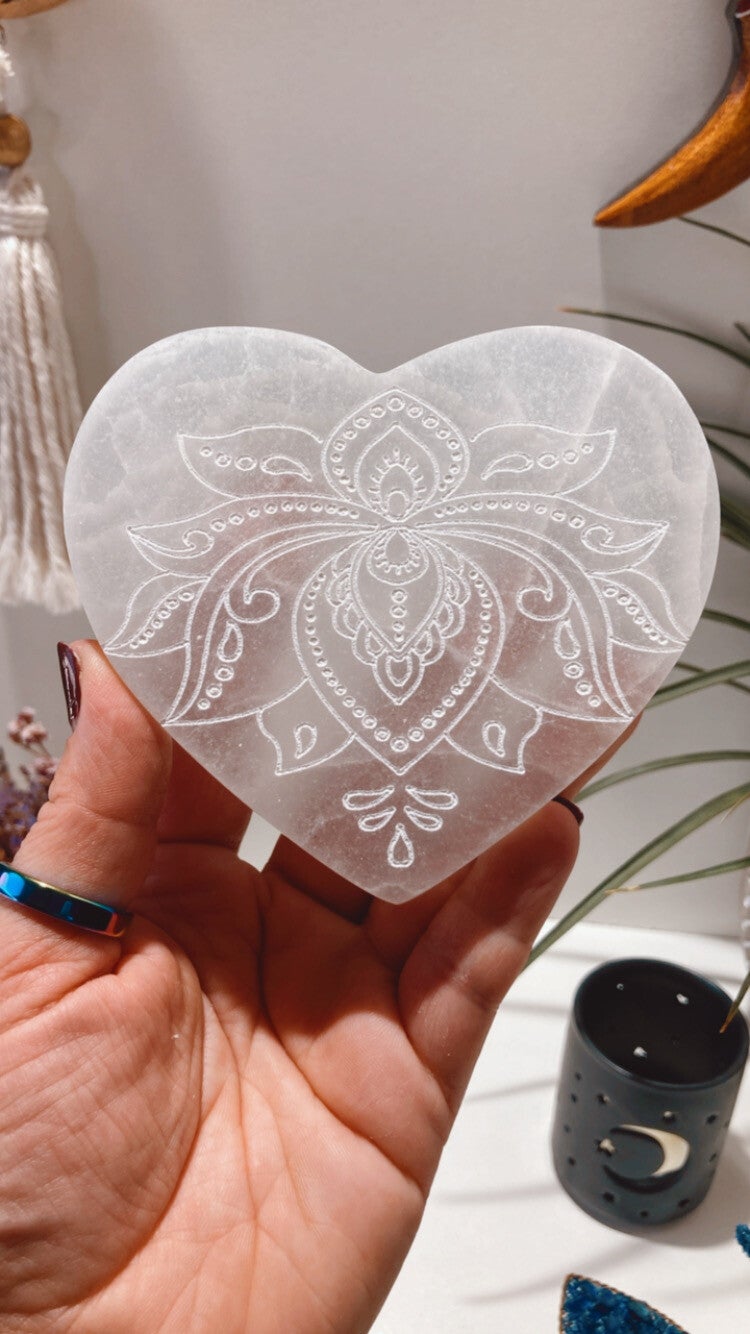 Prachtige Seleniet schijf in de vorm van een hart. Perfect om je edelstenen mee te reinigen ✨.