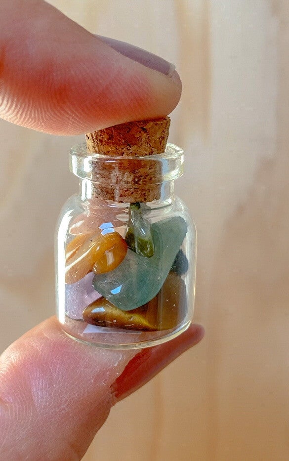 Super cute flesje met een mix van edelstenen. Met onder andere Carneool, Agaat, Rozenkwarts, Amethist, groene Aventurijn, Drakenbloed Jaspis, Unakiet, Oceaan Jaspis, Tijgeroog en Kwarts.