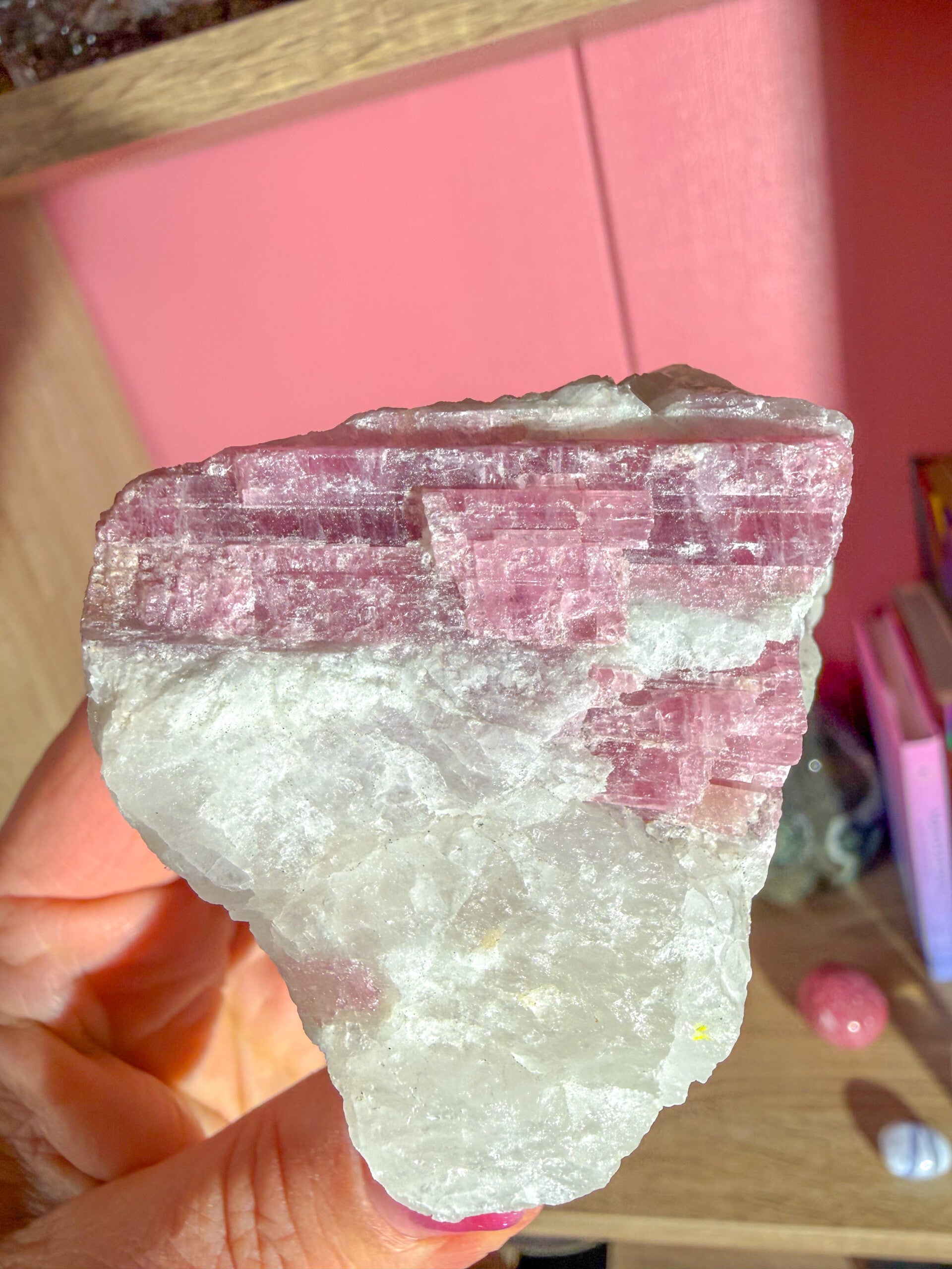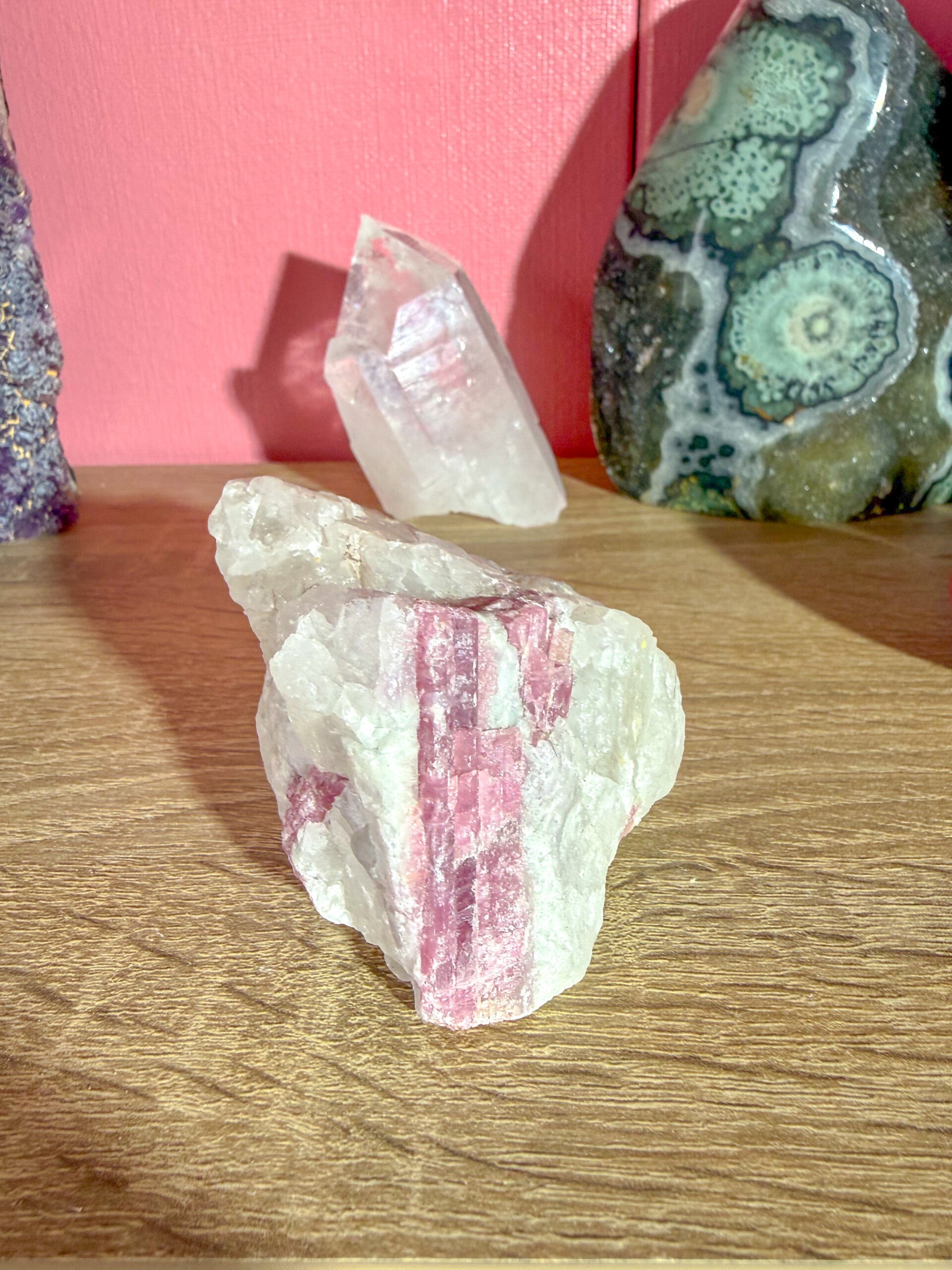 Unicorn stone is een bijzondere combinatiesteen van roze Toermalijn, Lepidoliet en kwarts.