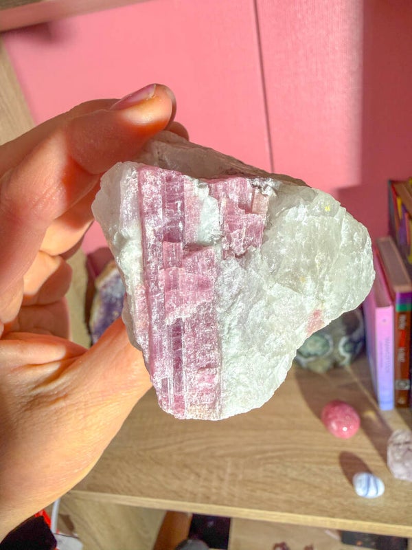 Naast de algemene eigenschappen van toermalijn stimuleert roze toermalijn liefdevol denken en handelen (ook naar jezelf), compassie, empathie en medeleven. Het kalmeert bij stress, zorgen, depressieve gevoelens en angst. De zachte en beschermende energie van deze steen is heel geschikt voor kinderen en (hoog)gevoelige mensen.