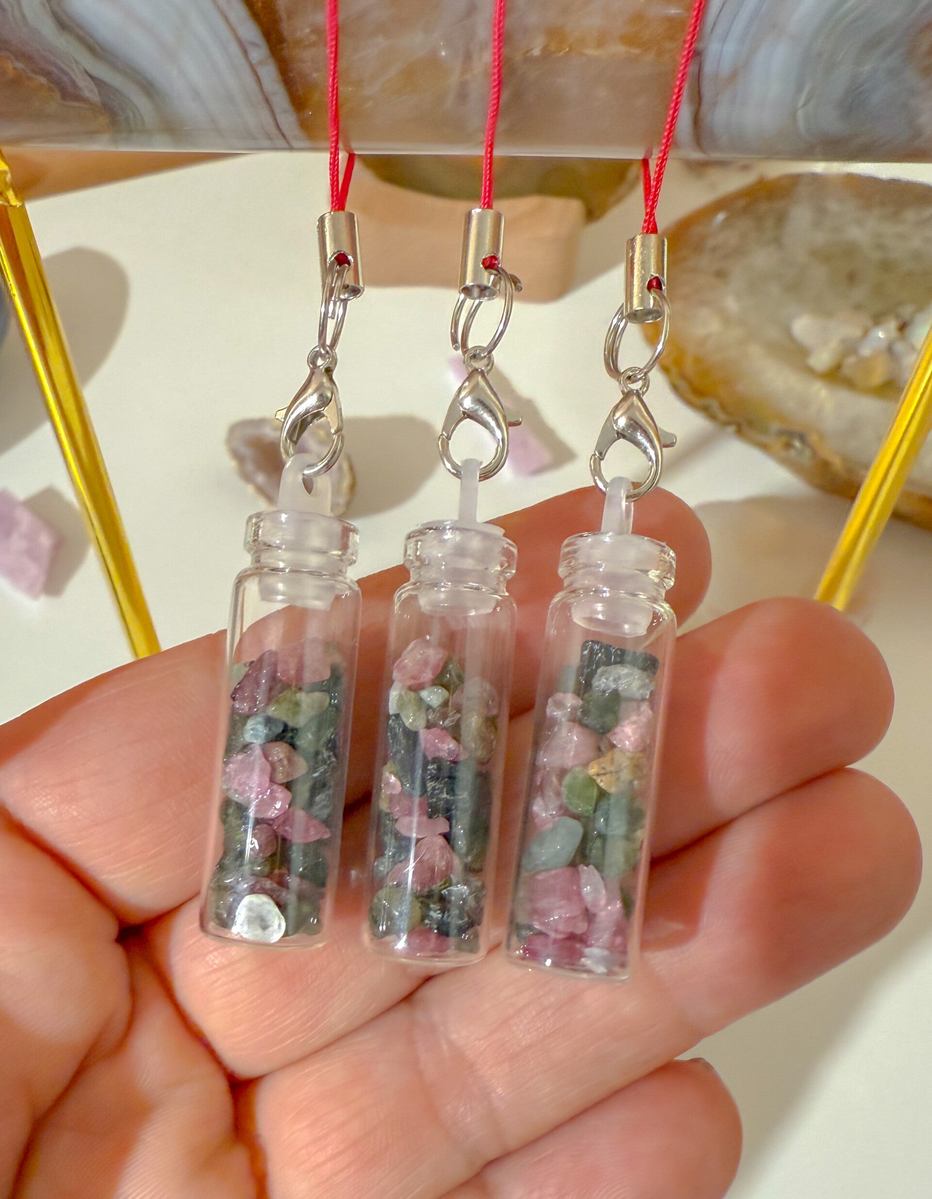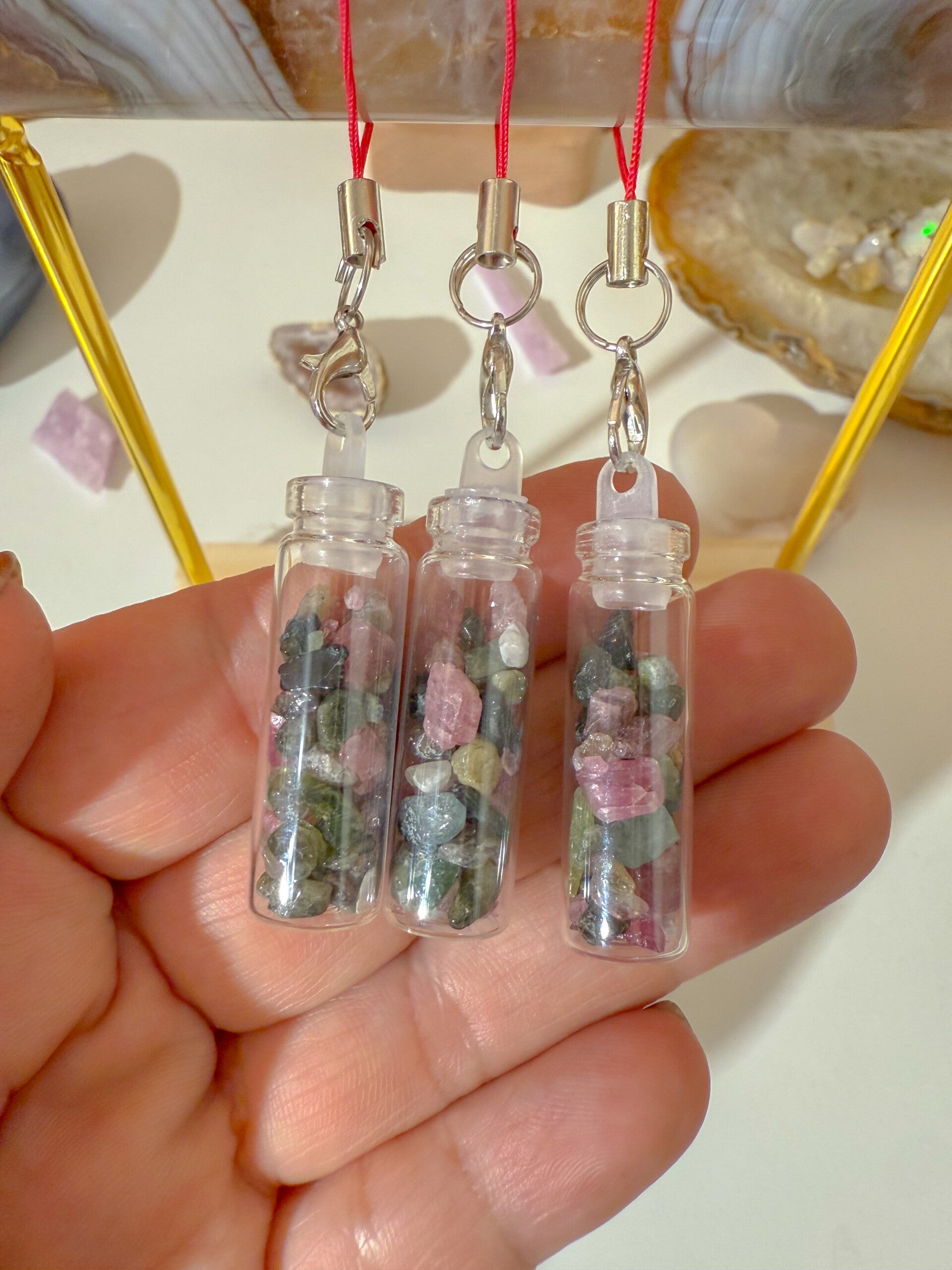 Een glazen flesje gevuld met roze, groene en zwarte Toermalijn.