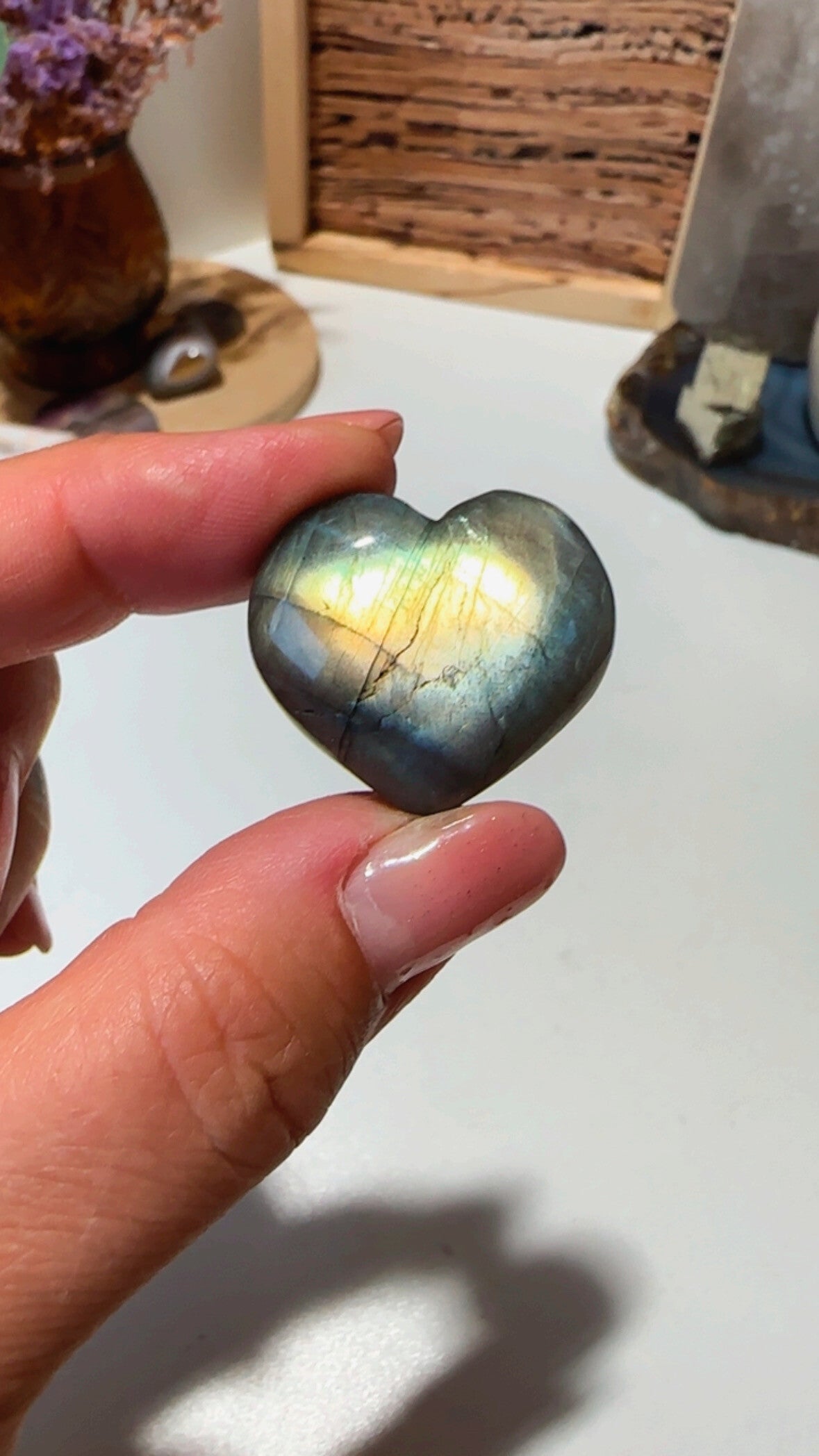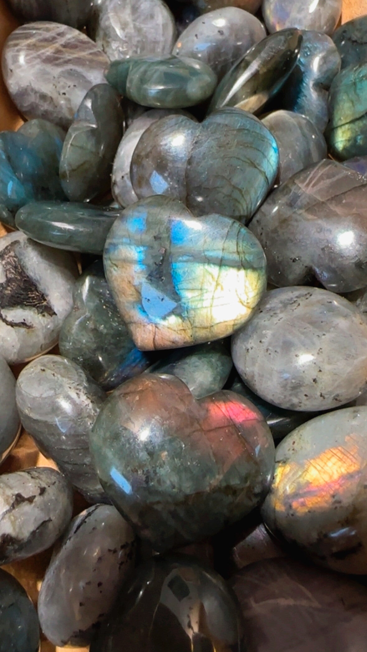 Supermooie labradoriet harten met verschillende kleuren flashes aan alle kanten ✨.