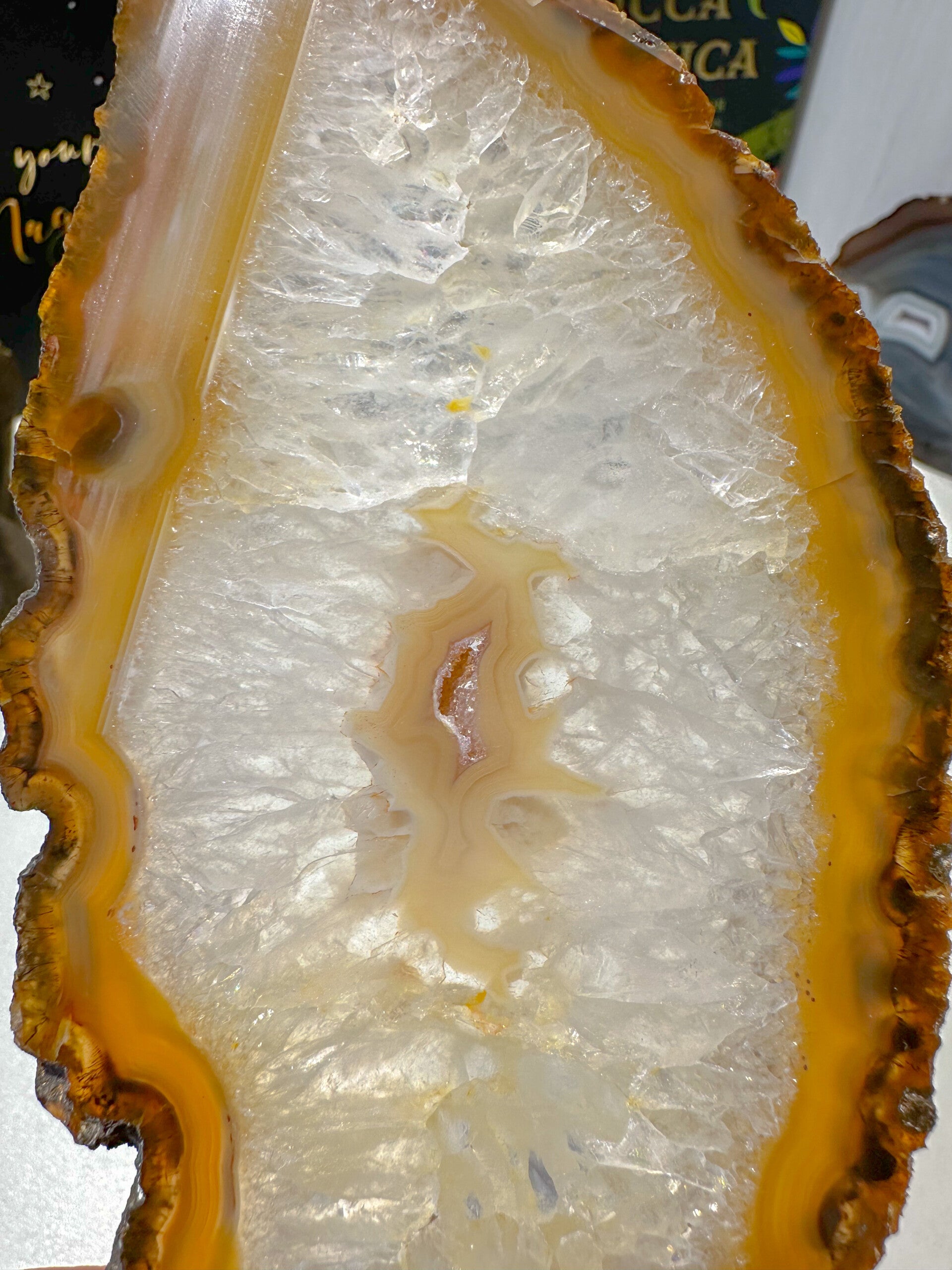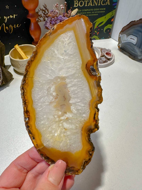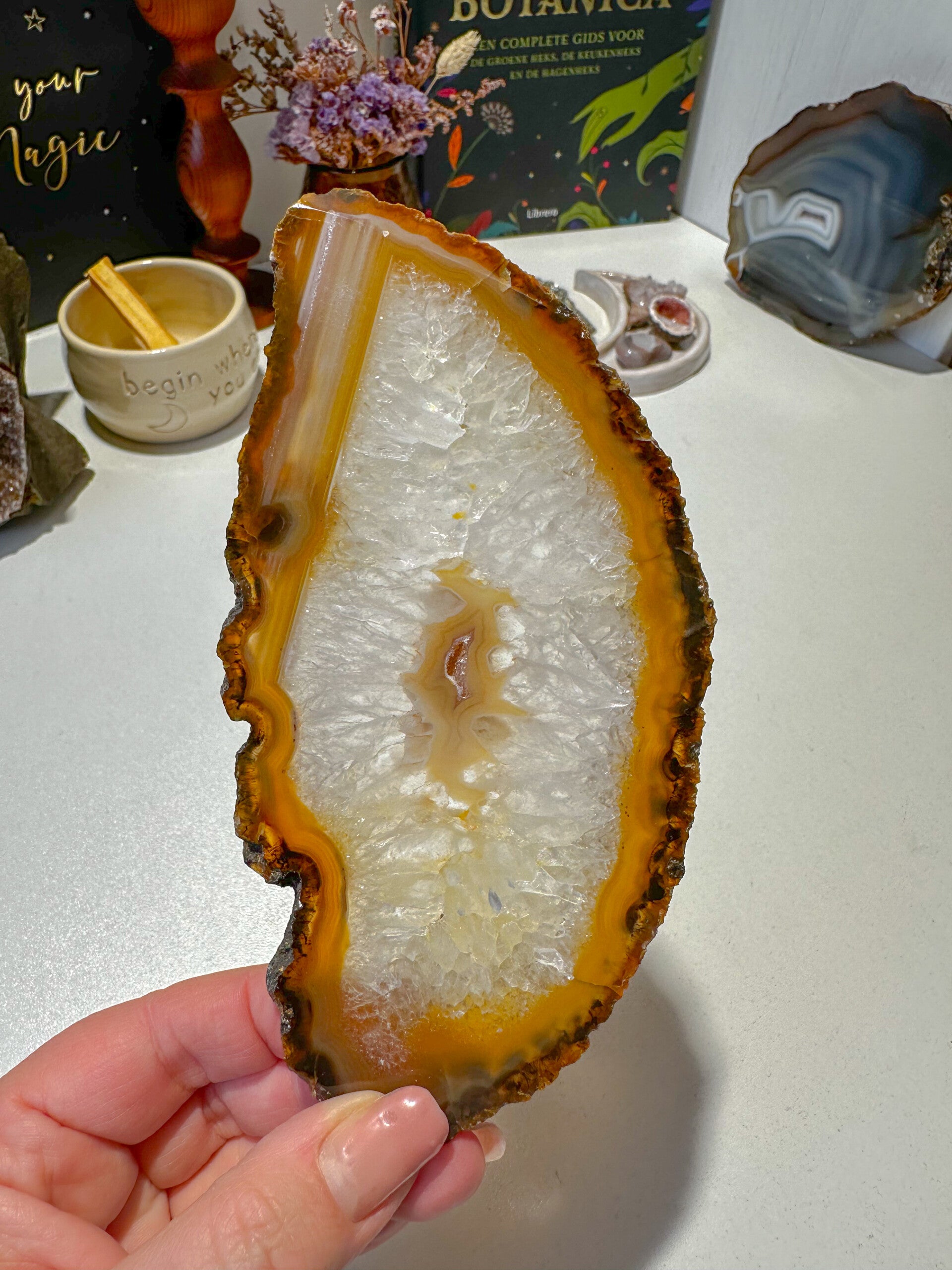 Prachtige A kwaliteit Agaatschijf met rozige kristalletjes in het midden.
