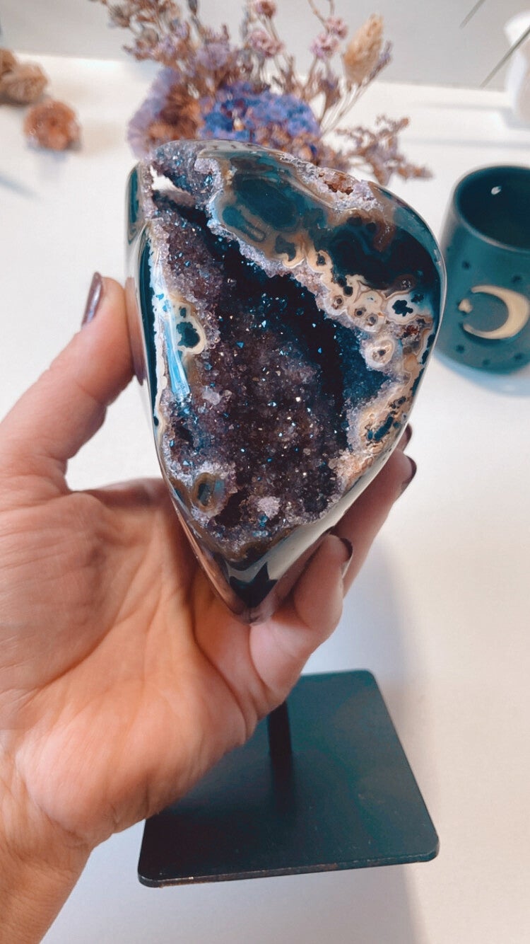 Super mooie druzy Agaat met Amethist op standaard van 1652gram en ongeveer 17x14cm.