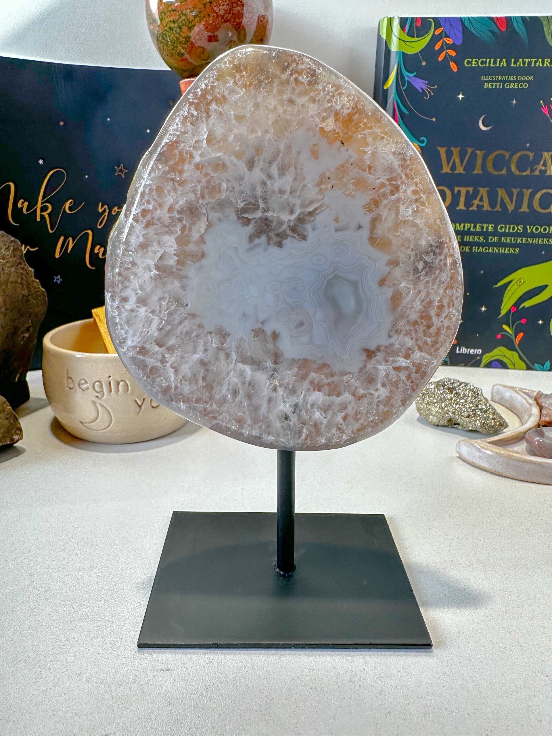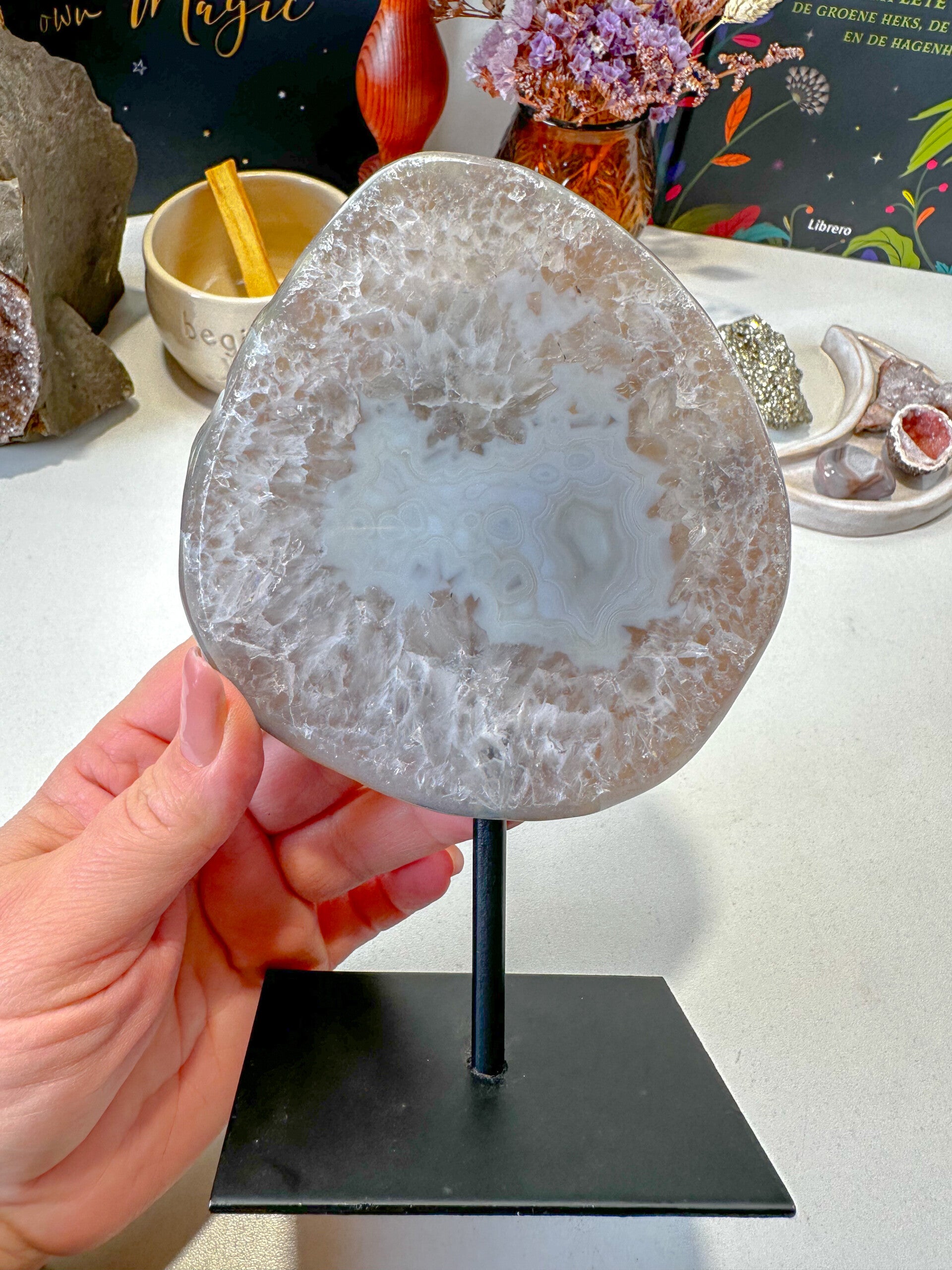 Agaat werkt aardend, stabiliserend en beschermend. De steen werkt kalmerend, laat je veilig voelen en zorgt voor zowel geestelijke als emotionele rust en balans. Het helpt jezelf accepteren en helpt vertrouwen hebben in jezelf .