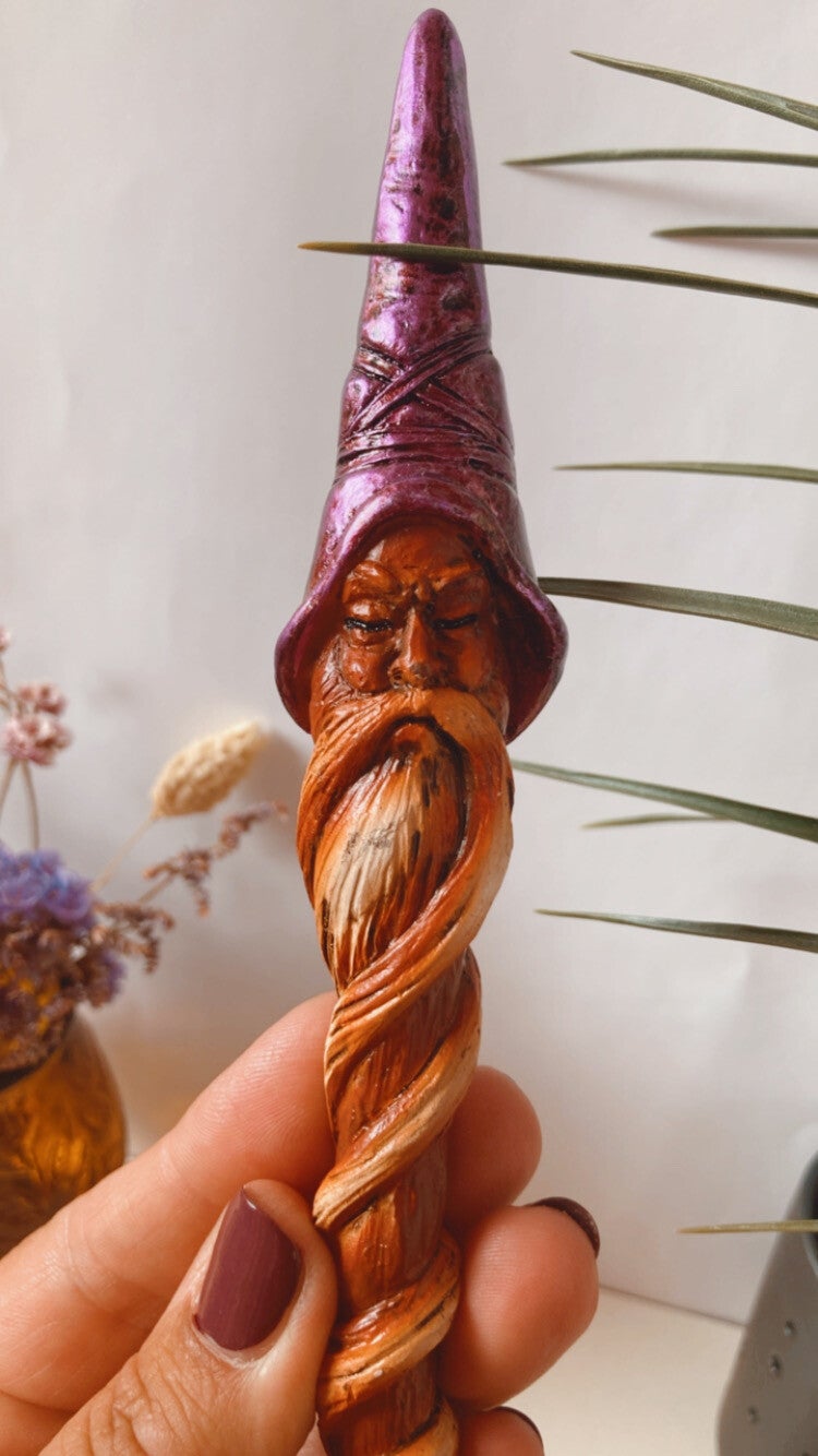 Deze 24 cm lange toverstaf is voorzien van een wijze tovenaar met een parelmoerachtige paarse hoed en een lange witte baard. Deze toverstaf is is een must voor elke heks of tovenaarscollectie.