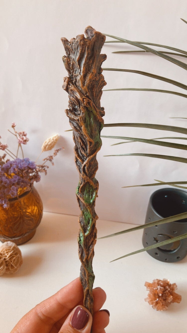 Deze mooie decoratieve toverstaf toont de Forest Wizard geaccentueerd met groene bladeren en gedraaide takken. Perfect voor natuurliefhebbende heksen en tovenaars die gek zijn op de mythologie rondom de populaire Green Man.
