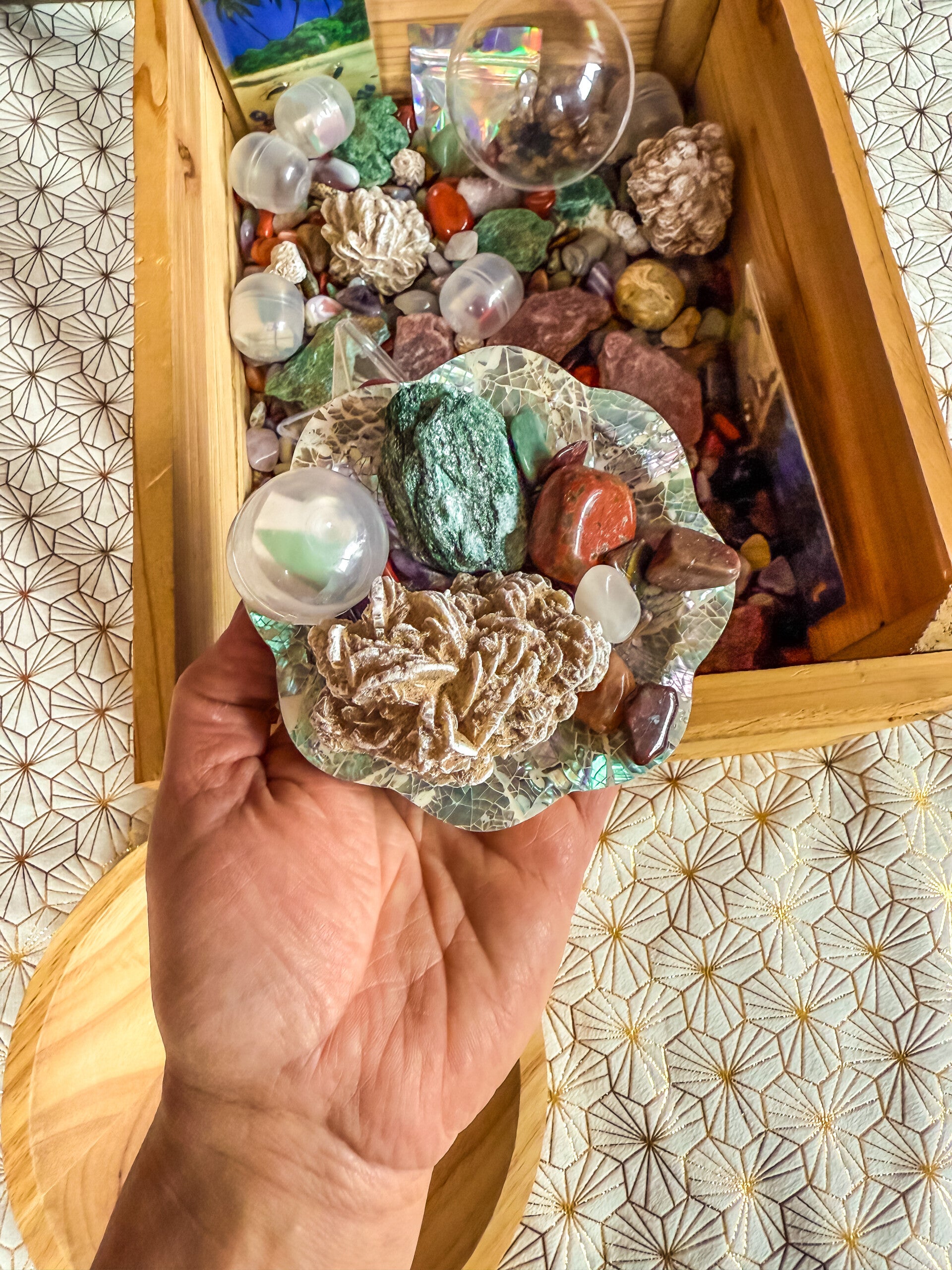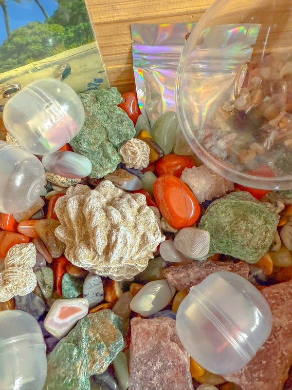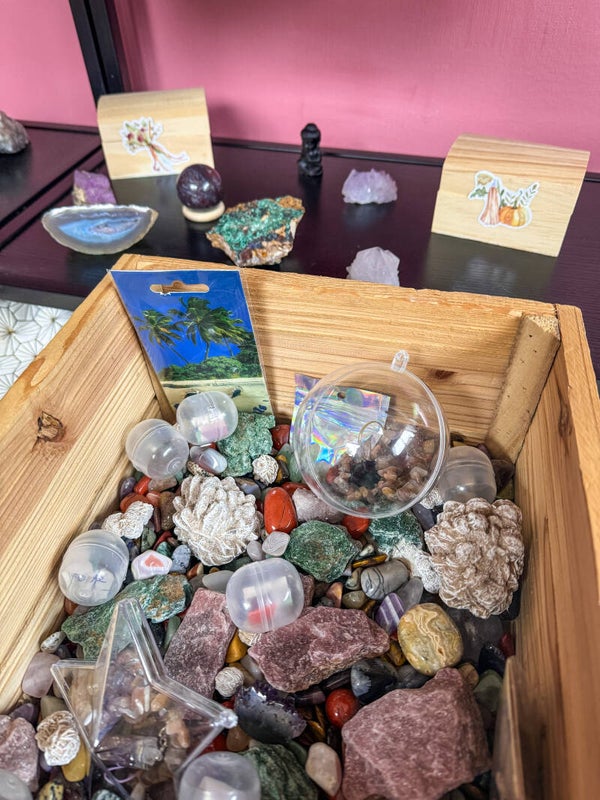* Ruwe stenen zoals Woestijn roosjes, Amethist, Spirit kwarts, Lepidoliet, Fuchsiet, Agaat geodes.