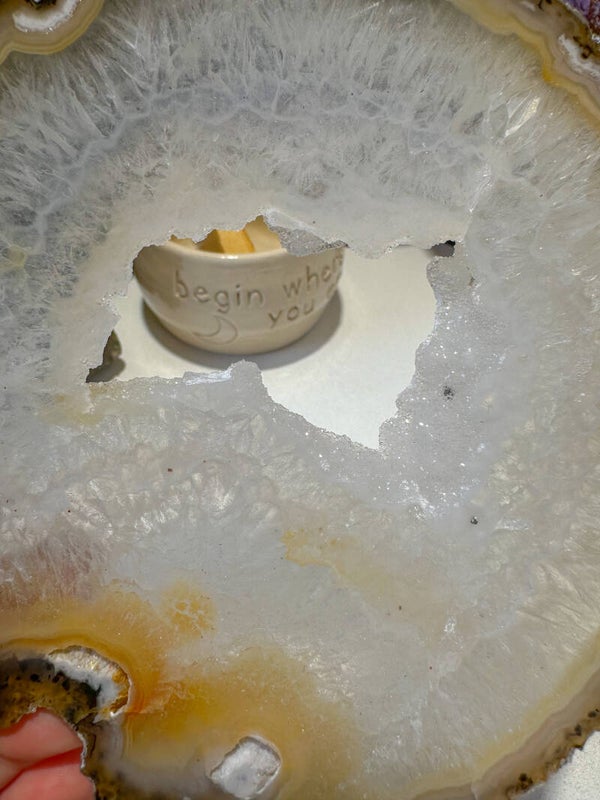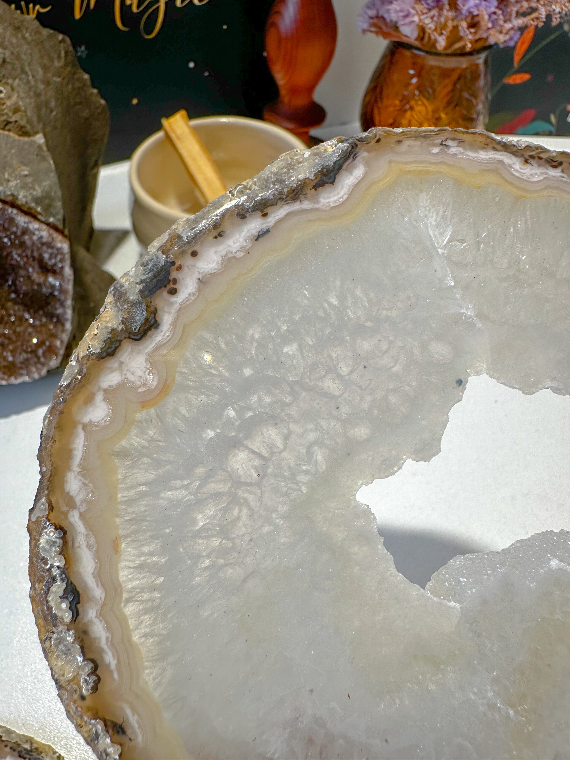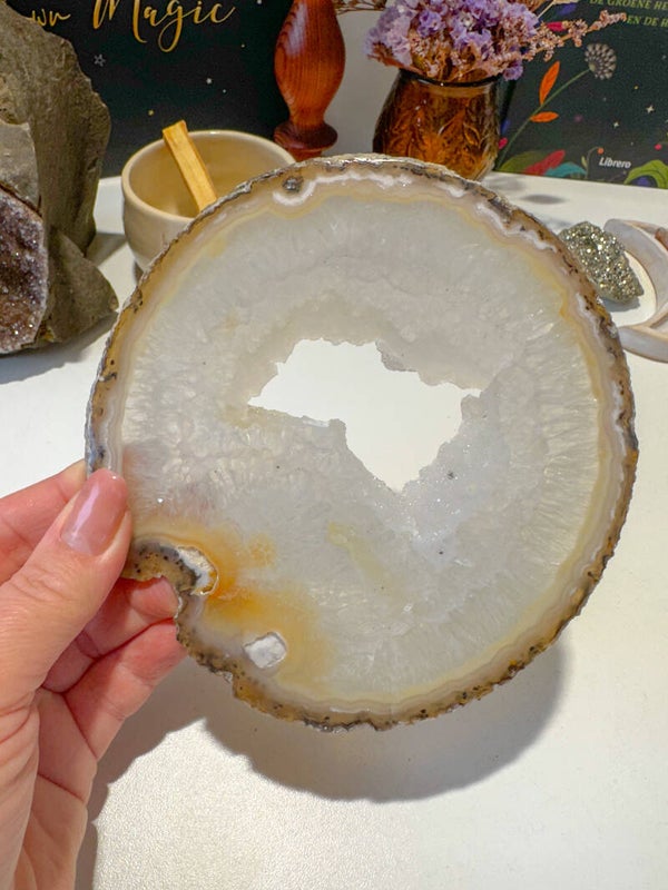 Hele mooie grote A kwaliteit Agaatschijf met allemaal kristallen binnen in.
