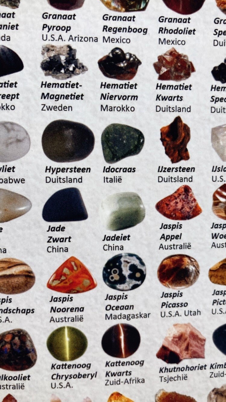 Grote edelsteen poster met de 800 belangrijkste edelstenen en hun vind plaats.