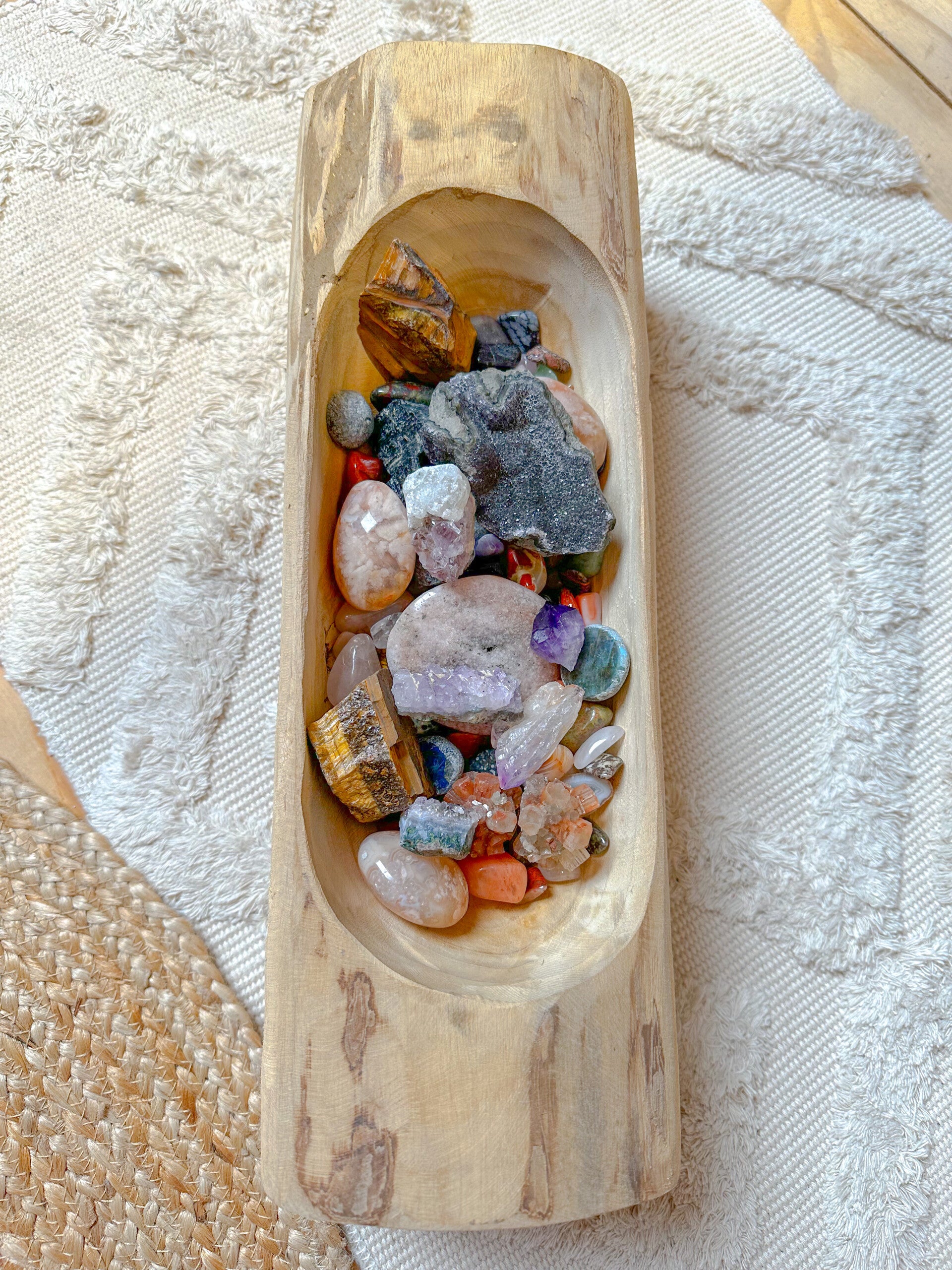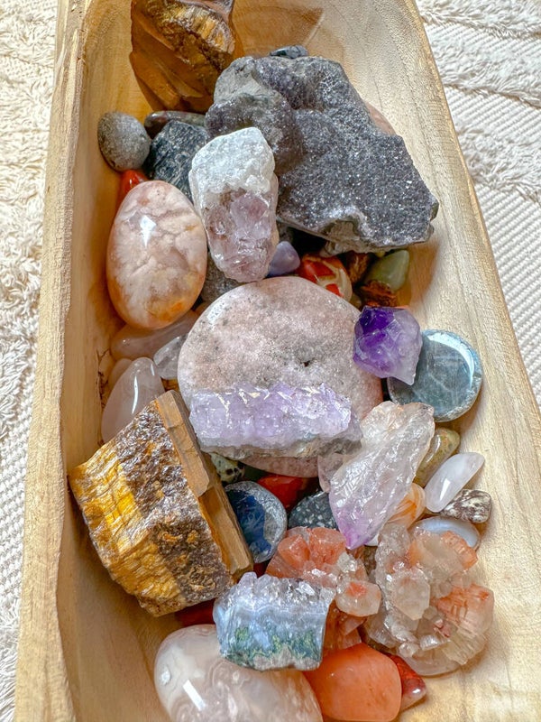 - Ruwe stenen zoals Aragoniet roosjes, Zonnesteen, Pyriet, Tijgeroog, Amazoniet, Agaat geodes.
