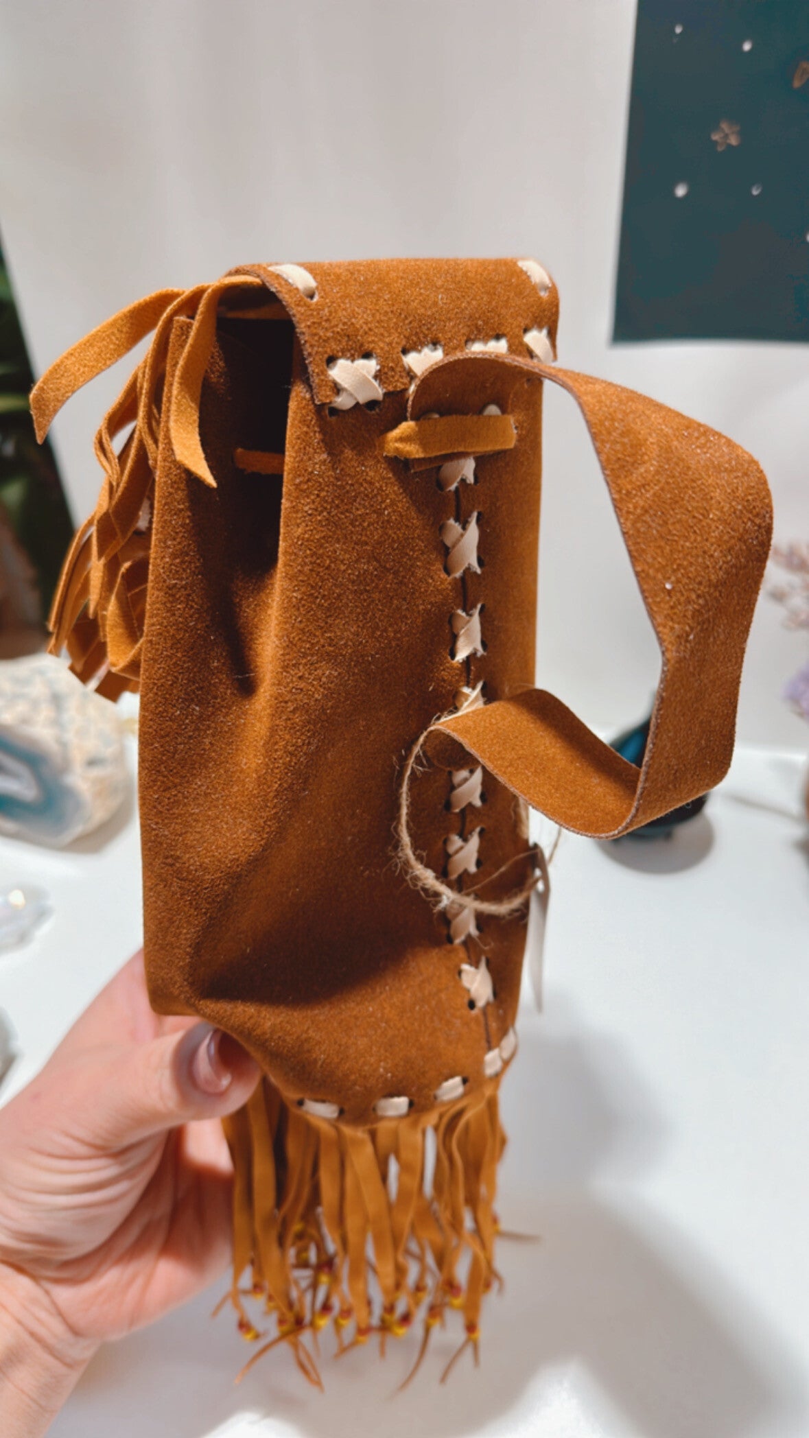 De tas heeft een flap en 1 binnenvak. De leren tas is afgewerkt met franje en kralen.